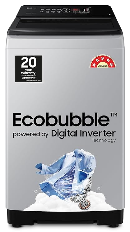 You deserve a washing machine that combines efficiency and advanced technology, and the Samsung 8 kg, 5 star, Eco Bubble Tech, Digital Inverter Motor, Soft Closing Door, Fully-Automatic Top Load Washing Machine (WA80BG4441BGTL, Light Gray) delivers exactly that. With its innovative Eco Bubble technology, this machine ensures a thorough clean while saving on energy and water costs. The Digital Inverter Motor enhances durability and keeps noise levels minimal, making laundry day a breeze. Plus, the stylish design and user-friendly features perfectly fit modern living, ensuring your laundry experience is both effective and convenient.